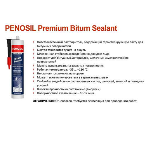 Битумный герметик для крыши Penosil Bitum Н1462 обладает высокой адгезией к большинству материалов. Состав обеспечивает отличную гидроизоляцию, применяется для ремонта крыш, устранения течей, уплотнения швов между кровлей и дымоходом. Герметик отлично схватывается даже на влажных поверхностях, быстро покрывается пленкой, что делает его водостойким сразу после нанесения.