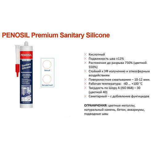 Силиконовый санитарный герметик Penosil S прозрачный используется в помещениях с повышенной влажностью, таких как кухня и ванная комната. Состав на основе силикона обладает водостойкостью и содержит фунгициды для защиты от плесени и грибка. Герметик отличается стойкостью к УФ-лучам.