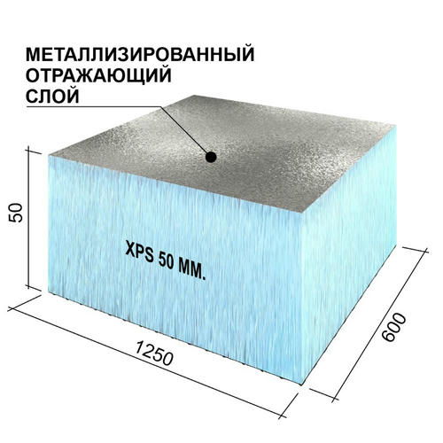 Панель теплоизоляционная Ruspanel RPG Foil 1250х600х50 мм экструдированный полистирол с нанесенным слоем полимерцемента для организации контактной поверхности и готовности под дальнейшую отделку. Благодаря высокому уровню фабричной готовности – материал оптимизирует мокрые процессы, удобен в работе, снижает трудозатраты и повышает качество. Металлизированное покрытие обеспечивает 97% отражения теплового излучения, поэтому объекты защищенные фольгированными панелями прекрасно теплоизолированы и защищены от влаги.