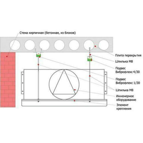 В качестве упругого элемента подвеса применяется специальный виброизолирующий материал Sylodyn. Каждый вид подвеса рассчитан на определенную нагрузку. Для подвеса оборудования используются шпильки с резьбой М8.