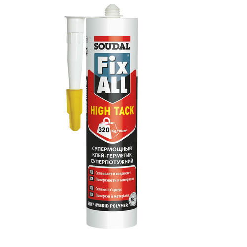Клей-герметик Soudal Fix All HT белый 290 мл – очень прочный, эластичный клей-герметик на основе гибридных полимеров SMX с очень хорошим начальным сцеплением (высокой силой начального связывания). Клеит также влажные материалы. ;