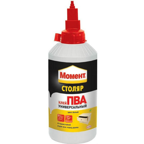 Клей Момент Столяр представляет собой универсальный клей на основе водной дисперсии ПВА, предназначенный для всех пород дерева. Подходит для монтажного склеивания всех пород дерева, ДСП, ДВП, МДФ, многослойной фанеры, приклеивание декоративного бумажно-слоистого пластика и шпона.