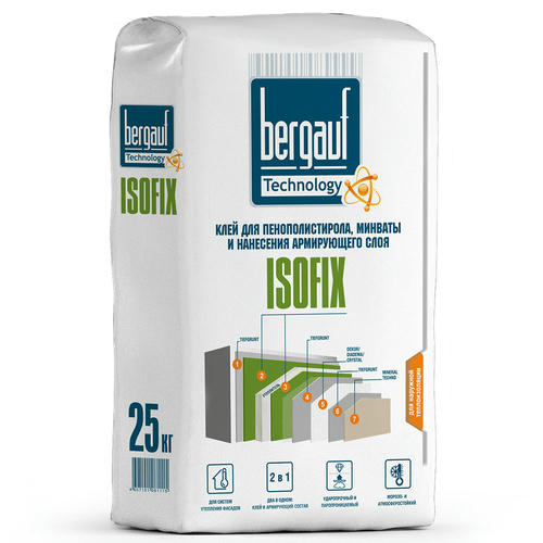 Клей Bergauf Isofix предназначен для приклеивания пенополистирола, минваты, а также нанесения армирующего слоя. Может использоваться для внутренних работ в помещениях с любой влажностью и для наружных работ.
