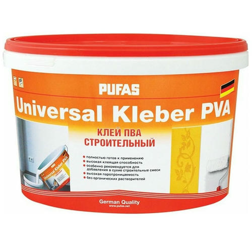 Клей строительный ПВА Pufas универсальный морозостойкий 10 кг предназначен для приклеивания бумажных обоев, склеивания изделий из картона, фанеры и древесных плит. При разбавлении водой в 8 раз (1:7) хорошо подходит для предварительного грунтования стен перед оклейкой обоями. Добавляется в строительные смеси при приготовлении растворов в качестве пластифицирующей добавки.