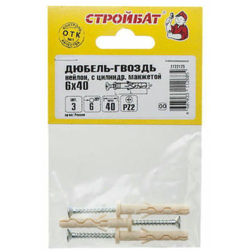 Дюбель-гвоздь нейлоновый с цилиндрической манжетой применяется для крепления всевозможных деталей к бетону, полнотелому кирпичу методом сквозного монтажа. Состоит из дюбеля с двухсегментной распорной частью с цилиндрическим бортиком, предотвращающим проваливание дюбеля в монтажное отверстие, и гвоздя с ударной резьбой. Цилиндрический бортик обеспечивает более надежное крепление благодаря большой площади соприкосновения с прикрепляемой деталью. Используется преимущественно в быту и строительстве. Нейлон обладает повышенной морозоустойчивостью, что позволяет использовать дюбель-гвоздь при монтаже на открытом воздухе.