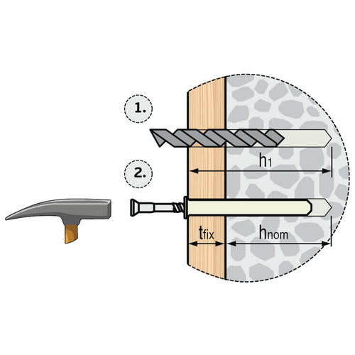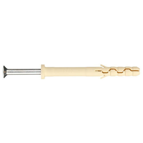 Предназначен для легких креплений (небольшие нагрузки) в твердые материалы: полнотелый кирпич, бетон, природный камень. Нейлон обеспечивает надежное сцепление с материалом основания. Резьбовой оцинкованный гвоздь повышенной прочности заранее установлен в дюбель. Основным преимуществом дюбеля является – форма, благодаря которой монтаж осуществляется одним ударом молотка и большая нерабочая часть дюбеля, позволяющая осуществлять монтаж сквозь прикрепляемый материал. Применение: для направляющих гипсокартона, плинтусов, фанерного основания под паркетные полы, металлокаркас и пр.
