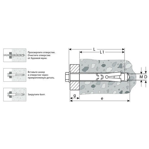 Для монтажа конструкций к полнотелым основаниям: поверхностям из бетона, полнотелого кирпича или природного камня. Анкер устанавливается в предварительно просверленное и очищенное от буровой муки отверстие и расклинивается при закручивании болта
