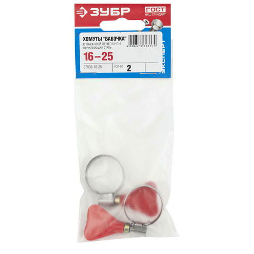 ЗУБР 2 шт., 16-25 мм, накатная лента 9 мм,”Бабочка” хомуты, Профессионал