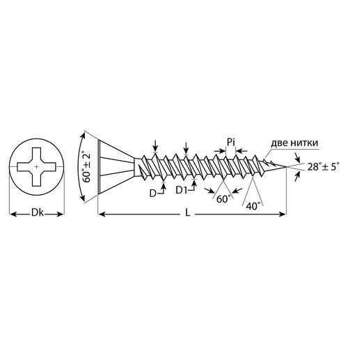 Саморезы для крепления гипсоволоконных листов (ГВЛ) изготовлены из стального прутка с высоким содержанием углерода. Контроль за геометрией самореза начинается с калибровки прутка и заканчивается тщательной проверкой размеров готового изделия. Нормативная твердость стали достигается термической обработкой. Поверхностная твердость 550-800HV, твердость в сердцевине 240-425HV. Саморезы легко вкручиваются обычным шуруповертом или отверткой с крестообразным шлицем PH2 (DIN). Предварительное сверление в скрепляемых материалах не требуется. Геометрические размеры: диаметр головки (Dk) – 6.9-7.3мм, диаметр высокой резьбы (D) – 4.05-4.25мм, диаметр низкой резьбы (D1) – 2.9-3.2мм, шаг резьбы (Pi) – 1.59мм.