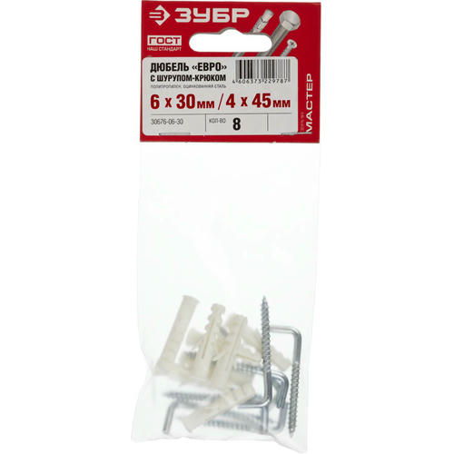 ЗУБР 30 x 6 мм, 8 шт., дюбели распорные в комплекте с шурупом-крюком ЕВРО