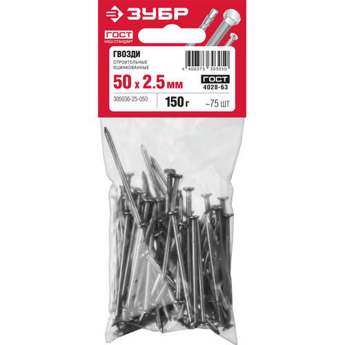 ЗУБР 50 х 2.5 мм, 150 гр., ГОСТ 4028-102, гвозди строительные оцинкованные