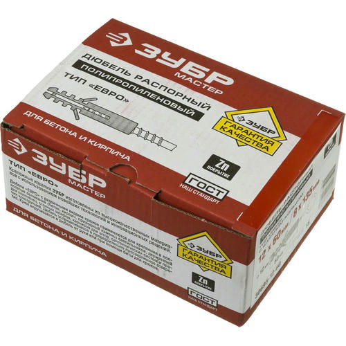 Распорные дюбели “ЕВРО” ЗУБР 30695-12-60, предназначены для крепления в полнотелые основания (бетон, кирпич, природный камень) светильников, держателей для полотенец, стенных шкафов, карнизов для штор, сантехнических систем и прочих конструкций. Дюбель устанавливается в предварительно просверленное отверстие. Диаметр предварительного сверления: 12 мм. Крюк вкручивается в дюбель от руки или при помощи биты для крюков. Дюбели изготовлены из высококачественного полипропилена и используются для крепления различных элементов и конструкций к несущему основанию. Находят широкое применение в строительстве и быту для крепления полок, шкафов, картин, светильников, сантехники и т.п. Дюбель состоит из нераспорной части и распорной (рабочей) зоны, которая изменяет свои размеры (форму) при закреплении. Специально разработанные “усы” предотвращают проворачивание установленного дюбеля в отверстии. Полипропилен устойчив к воздействию влаги, что позволяет использовать дюбели при выполнении наружных работ.