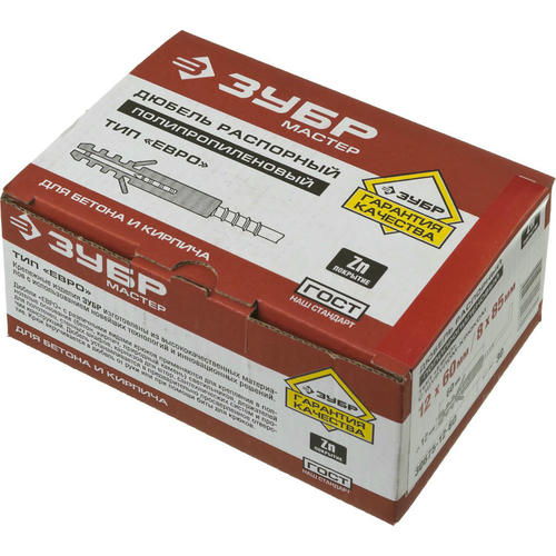 Распорные дюбели “ЕВРО” ЗУБР 30675-12-60, предназначены для крепления в полнотелые основания (бетон, кирпич, природный камень) светильников, держателей для полотенец, стенных шкафов, карнизов для штор, сантехнических систем и прочих конструкций. Дюбель устанавливается в предварительно просверленное отверстие. Диаметр предварительного сверления: 12 мм. Крюк вкручивается в дюбель от руки или при помощи биты для крюков. Дюбели изготовлены из высококачественного полипропилена и используются для крепления различных элементов и конструкций к несущему основанию. Находят широкое применение в строительстве и быту для крепления полок, шкафов, картин, светильников, сантехники и т.п. Дюбель состоит из нераспорной части и распорной (рабочей) зоны, которая изменяет свои размеры (форму) при закреплении. Специально разработанные “усы” предотвращают проворачивание установленного дюбеля в отверстии. Полипропилен устойчив к воздействию влаги, что позволяет использовать дюбели при выполнении наружных работ.