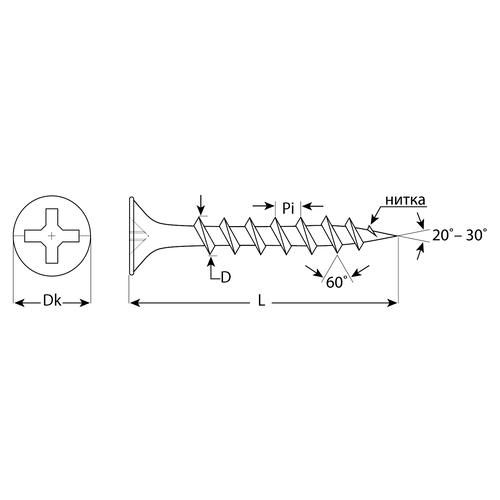 • Резьба с редким шагом разработана для крепления гипсокартона к деревянной обрешетке без крошения волокнистой структуры дерева.