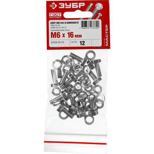 ЗУБР M6 x 16 мм, 12 шт., болт с шестигранной головкой в комплекте с гайкой, шайбой, шайбой пружинной