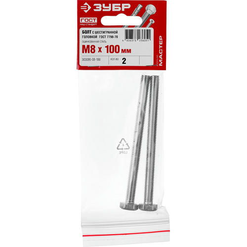 ЗУБР M8 x 100 мм, 2 шт., болт с шестигранной головкой ГОСТ 7798-70 Мастер