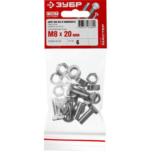 ЗУБР M8 x 20 мм, 6 шт., болт с шестигранной головкой в комплекте с гайкой, шайбой, шайбой пружинной