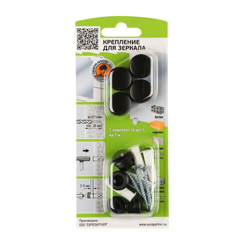 Круглые держатели втулки обхватывают зеркало сверху и снизу, плотно прижимая его к стене. Колпачок покрыт однокомпанентной эмалью для пластмасс с последующим защитным слоем лака. Такое покрытие имеет очень высокие показатели стойкости к спиртосодержащим веществам, кремам, моющим средствам и истиранию. Входящий в комплект универсальный дюбель позволяет закрепиться в любые материалы основания. Один комплект крепления рассчитан на установку зеркала толщиной до 5 мм и общей площадью до 1 кв.м.