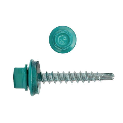 Кровельные саморезы окрашиваются согласно каталогу RAL – порошковой краской высокого качества. Краска распыляется на оцинкованный саморез. Кровельный саморез по дереву имеет шестигранную головку и шайбу с epdm-прокладкой, крепеж надежно защищён от попадания влаги. Красится только шляпка. Окрашенный кровельный саморез по дереву имеет на конце сверло РТ-1. Его диаметр чуть меньше диаметра резьбы. Это даёт возможность метизу надёжно закрепиться в основании. Применяется для монтажа цветной кровли и профнастила к деревянной обрешетке. Саморез имеет шестигранную головку под ключ-насадку и шайбу с резиновой прокладкой.