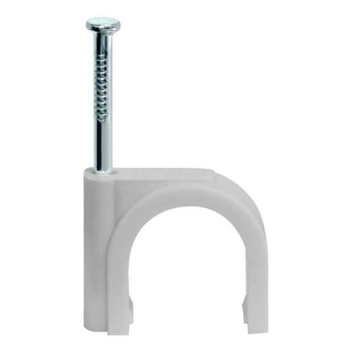 Пластиковая скоба имеет круглую форму и высоту 10 мм. Предназначена для быстрого и надежного крепления круглых и плоских кабелей. Возможно крепление к дереву, прессованному картону и швам кирпичной кладки, к штукатурке, бетону, кирпичу. Изготовлена из гибкого негорючего ударопрочного полипропилена, гвоздь – закаленная оцинкованная сталь.