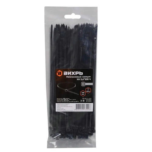 Хомут нейлоновый Вихрь 73/9/1/27 3,6х200 мм черный 100 шт соединительный элемент, применяется для крепления и фиксации различных конструкций, систем монтажа, электропроводки и многого другого. Может использоваться при маркировке электромонтажных кабелей, т.к хомут одновременно выполняет функции крепежного изделия и стяжки для электропроводов. Хомуты являются достаточно быстрым и удобным способом крепления и бандажирования, также их можно использовать как в помещении, так и за его границами.