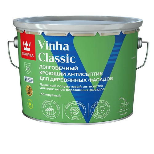Антисептик кроющий Tikkurila Vinha Classic База VC полуматовый 9 л для всех типов деревянных фасадов. Предназначена для окраски новых или обработанных ранее кроющей защитой Tikkurila Vinha Classic или лессирующими материалами наружных деревянных поверхностей, пиленых, строганных, бревенчатых поверхностей, а также термообработанной и пропитанной под давлением древесины.