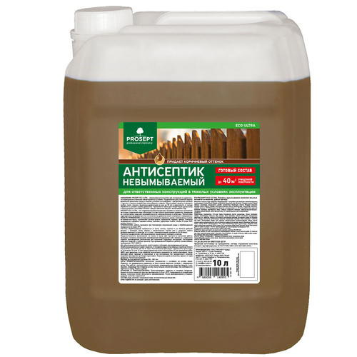 Антисептик невымываемый Prosept Eco Ultra невымываемый антисептик для конструкций из древесины, эксплуатируемой в наиболее неблагоприятных условиях. Предназначается для усиленной защиты древесины различных пород в тяжелых условиях эксплуатации – при длительном контакте с грунтом и прямом воздействии атмосферных осадков.