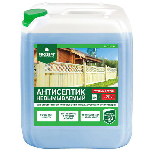 Антисептик невымываемый Prosept Eco Ultra невымываемый антисептик для конструкций из древесины, эксплуатируемой в наиболее неблагоприятных условиях. Предназначается для усиленной защиты древесины различных пород в тяжелых условиях эксплуатации – при длительном контакте с грунтом и прямом воздействии атмосферных осадков.