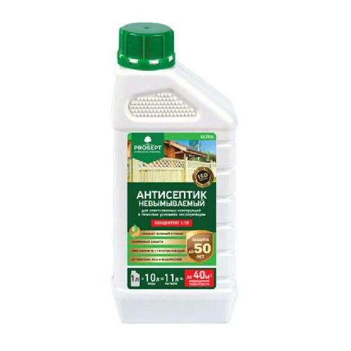 Антисептик невымываемый Prosept Ultra 008-1 1 л для конструкций из древесины, эксплуатируемой в наиболее неблагоприятных условиях. Предназначен для усиленной защиты древесины различных пород в тяжелых условиях эксплуатации – при длительном контакте с грунтом и прямом воздействии атмосферных осадков. Обеспечивает защиту от домового грибка, гнили, плесени, насекомых-древоточцев на срок до 50 лет в зависимости от метода обработки и условий службы древесины. Применяется также для импрегнации древесины в промышленных масштабах методом «вакуум-давление-вакуум», вымачивание и др.