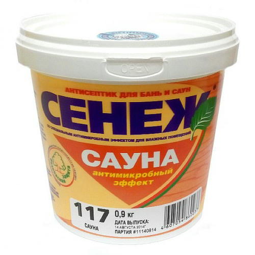 Антисептик «Сенеж Сауна» предназначен для защиты древесины внутри бань и саун от плесневых, окрашивающих и дереворазрушающих грибов, водорослей и насекомых-древоточцев в условиях интенсивного циклического увлажнения и воздействия высоких температур. Впервые на рынке, благодаря дополнительному антимикробному эффекту, «Сенеж Сауна» уничтожает бактерии — возбудители инфекционных заболеваний людей (E.coli, B.subtilis, B.cereus и др.), характерные для мест общего пользования.