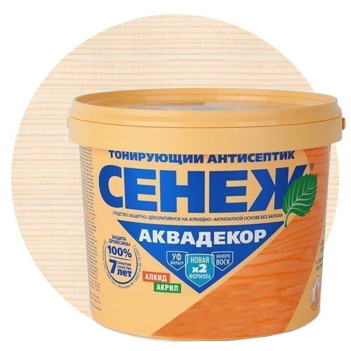 Антисептик «Сенеж Аквадекор» – современный готовый к применению тонирующий антисептик с УФ фильтром на акрилатной основе. Предназначен для долговременной защиты древесины от атмосферных осадков, плесневых, деревоокрашивающих и дереворазрушающих грибов, водорослей и насекомых-древоточцев, а также декоративной отделки под ценные породы.
