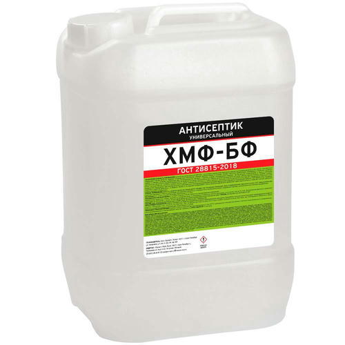 Антисептик универсальный ХМФ-БФ – это готовый к применению водный раствор для консервации древесины, без запаха, незначительно корродирует чёрные металлы, содержит огнезащитные компоненты, образует двойную защиту от гниения, синевы, насекомых-древоточцев, атмосферных, почвенных и домовых грибов в тяжелых условиях эксплуатации при непосредственном контакте с грунтом и водой, атмосферными осадками, органическими загрязнениями, а также в замкнутом пространстве.