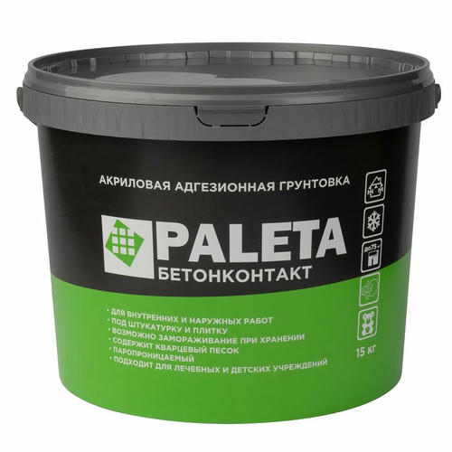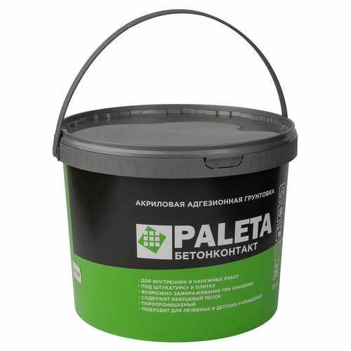 Бетонконтакт Палета улучшает адгезию материалов (в состав входит кварцевый песок, стирол-акрилатная дисперсия, являющаяся связующим компонентом).