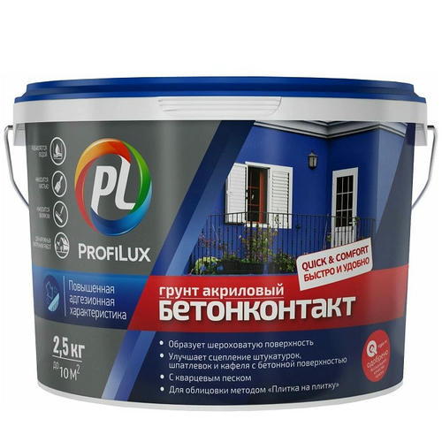 Грунт грубодисперсный Profilux Бетонконтакт предназначен для грунтования гладких, плотных, не впитывающих влагу оснований – монолитного бетона, массивных бетонных потолков, бетонных блоков, плитки – при внутренних и наружных работах, перед нанесением гипсовых или гипсово-известковых штукатурок, а также перед нанесением сухой штукатурки, а также для обработки покрытий перед укладкой на них новой керамической плитки на модифицированные цементные клеевые смеси.