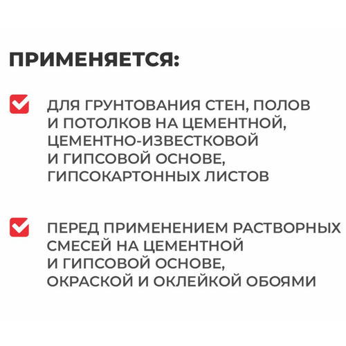 Продукт предназначен для грунтования стен, полов и потолков на цементной, цементно-известковой и гипсовой основе, гипсокартонных листов перед применением растворных смесей на цементной и гипсовой основе, окраской и оклейкой обоями с целью укрепления основания, снижения водопоглощения основы, преждевременного оттока воды из отделочных и клеевых смесей и обеспыливания основания перед проведением внутренних и наружных работ.