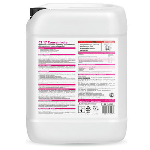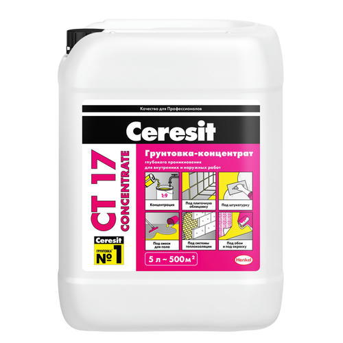 Грунтовка CT 17 Concentrate предназначена для обработки впитывающих, сильно впитывающих и непрочных оснований — бетона, цементных, известковых и гипсовых штукатурок, цементных, гипсовых и ангидритных стяжек, легкого и ячеистого бетона, кладок из керамического и силикатного