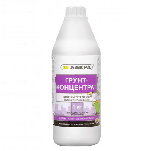 Грунт-концентрат Лакра 1 кг предназначен для пропитки различных конструкций из бетона, кирпича и штукатурки внутри и снаружи помещения. Концентрат необходимо разбавить водой в соотношении 1:2 или 1:6 в зависимости от структуры основания.