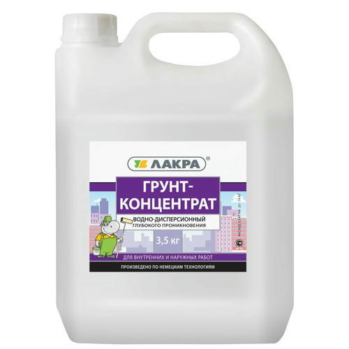 Грунт-концентрат Лакра 3,5 кг предназначен для пропитки различных конструкций из бетона, кирпича и штукатурки внутри и снаружи помещения. Концентрат необходимо разбавить водой в соотношении 1:2 или 1:6 в зависимости от структуры основания.
