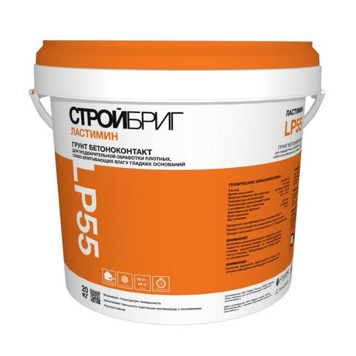 Грунтовка полимерная Стройбриг Ластимин LP-55 20кг предназначен для предварительной обработки и обеспыливания минеральных оснований. Применяется для подготовки поверхности под последующее нанесение отделочных материалов: штукатурок, шпаклёвок, ровнителей, наливных полов, плиточных клеёв, лакокрасочных материалов. Для внутренних и наружных работ.
