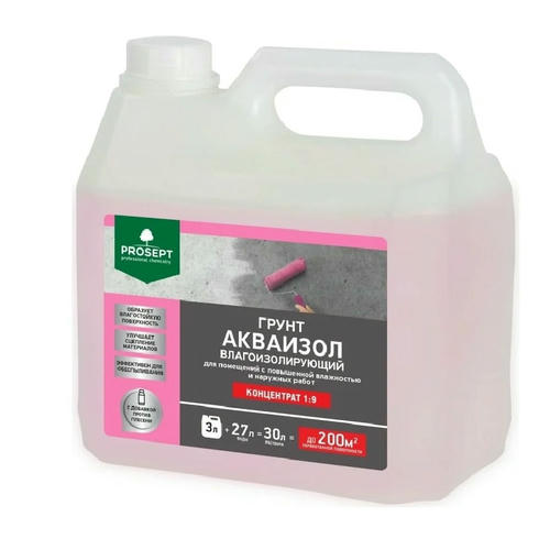 Грунт влагоизолирующий Prosept Акваизол 046-3 3 л увеличивает влагостойкость и прочность стен, потолков и полов. Глубоко проникает в основание, усиливая сцепление отделочных материалов при строительных и ремонтно-отделочных работах. Защищает от поражения плесенью и грибами. Подходит для различных поверхностей – бетон, гипсокартон, газобетон, гипсовые блоки, различные виды кирпича, камень, штукатурка, дерево, фанера, ДСП и другие материалы для защиты от влаги.
