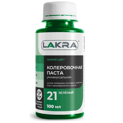 Колер Лакра № 21 зеленый 100 мл используется для создания необходимого оттенка цвета масляных, водно-дисперсионных и алкидных красок. Количество колорирующего средства в краске должно быть не больше 10% от общего объема.