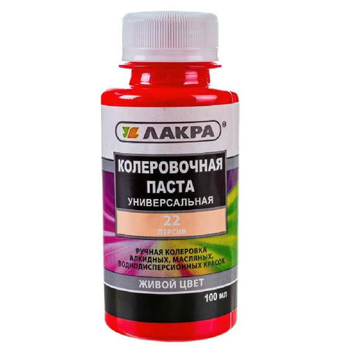 Колер Лакра № 22 персик 100 мл используется для создания необходимого оттенка цвета масляных, водно-дисперсионных и алкидных красок. Количество колорирующего средства в краске должно быть не больше 10% от общего объема.