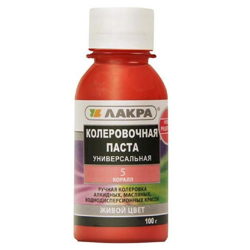 Колер Лакра № 5 коралл 100 мл используется для создания необходимого оттенка цвета масляных, водно-дисперсионных и алкидных красок. Количество колорирующего средства в краске должно быть не больше 10% от общего объема.