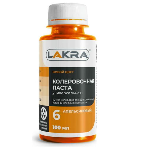Колер Лакра № 6 апельсиновый 100 мл используется для создания необходимого оттенка цвета масляных, водно-дисперсионных и алкидных красок. Количество колорирующего средства в краске должно быть не больше 10% от общего объема.