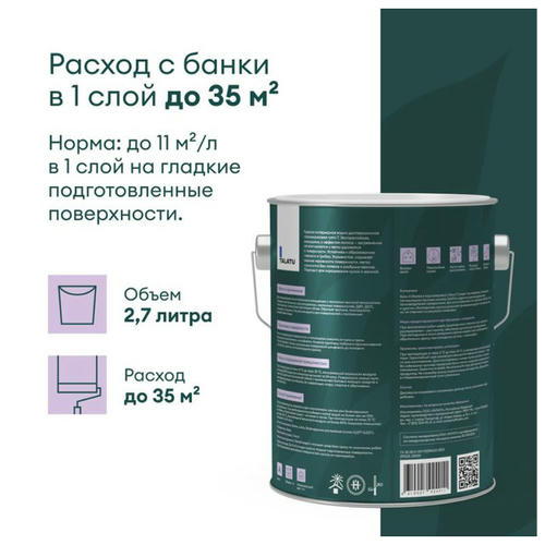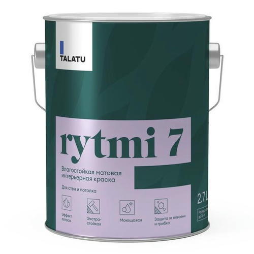 Водно-дисперсионная полиакриловая полуматовая краска для стен и потолка. Для окрашивания стен и потолков в помещениях с высокой эксплуатационной нагрузкой, с нормальной и повышенной влажностью, для коридоров, кухонь, ванных комнат. По бетонным, оштукатуренным, шпатлеванным поверхностям, гипсокартону, стеклообоям. Состав: вода, наполнители, диоксид титана (База А), дисперсия акрилового сополимера, добавки. Инструкция по применению. 1. Подготовка поверхности. Защитить неокрашиваемые места. Поверхность очистить от пыли, загрязнений, зашпатлевать, отшлифовать и нанести грунтовку talaalmi. Ремонтируемую поверхность расчистить от отслаивающейся краски, зашпатлевать, отшлифовать. Покрытия из алкидных и масляных красок матировать шлифованием. Старую побелку удалить. Нанести грунтовку talaalmi на впитывающие поверхности. 2. Условия выполнения работ. Температура воздуха, грунтовки и обрабатываемой поверхности должна находиться в интервале от 10С до 25С при относительной влажности воздуха не более 80%. 3. Окрашивание. Краску перемешать до однородности. Окрашивая первый слой ручным инструментом, разбавить краску чистой водой до 10% от объёма, второй слой уже не разбавлять или разбавить до нужной вязкости не более 10% от объёма. При безвоздушном распылении – не разбавлять. 4. Уход за покрытием. Покрытие высыхает за 24 часа. Очищать от пыли мягкой сухой щеткой или влажной губкой через 30 суток после окрашивания. Многократная влажная уборка со средствами без хлора, спиртов и абразивов.