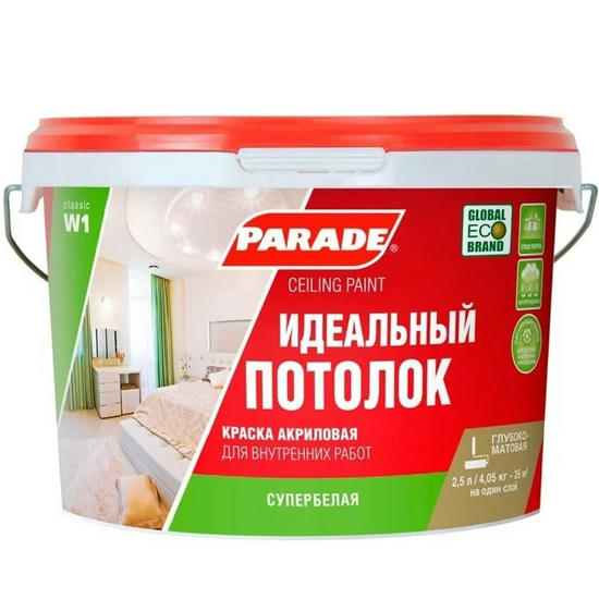 Краска для потолков Parade Classic W1 2,5 л — акриловая белая матовая краска для потолков. Обладает отличной укрывистостью. Образует гладкое покрытие исключительной белизны. Предназначается для внутренних работ в помещениях, не подвергающихся сильным эксплуатационным нагрузкам.