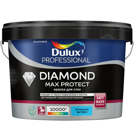 Dulux Diamond Max Protect – особо прочная матовая водно-дисперсионная краска повышенной износостойкости для стен в общественных и жилых помещениях с интенсивной эксплуатацией. Обладает превосходными рабочими характеристиками, максимально укрывистая, с нейтральным запахом. Визуально скрывает небольшие дефекты поверхности. Технология Anti Mark Technology создает невидимый барьер на поверхности, уменьшая контакт окрашенной стены с мягким пластиком или резиной (обувь, чемодан, велосипед, пылесос и т. д.). Минимизирует черные следы и защищает от потертостей. Поверхность дольше остается свежей и не требует ежегодной перекраски.