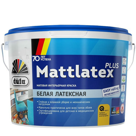 Краска латексная Dufa Mattlatex Plus матовая предназначена для интерьерных работ в помещениях с нормальными эксплуатационными нагрузками по поверхностям: штукатурка, бетон, кирпичная кладка, гипсокартоновые плиты, обои под покраску, ранее окрашенные водно-дисперсионными красками прочные поверхности. Поверхности на основе цемента или извести обрабатывать не ранее чем через 4 недели (проконтролировав высыхание и прочность). Сертифицирована для применения в детских и медицинских учреждениях.