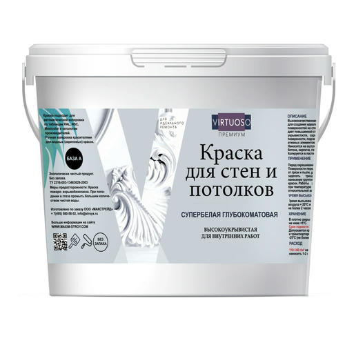 Краска Virtuoso Premium, для стен и потолков, супербелая, база А, 3 кг – создана специально для стен и потолков, а также декоративных элементов: карнизы, розетки, лепнина, плинтусы из различных материалов. Краска глубокоматовая, скроет неровности и дефекты поверхности, стыки декора. Не создает бликов. Краска не имеет неприятного запаха, не вызывает аллергии у людей и животных, поверхности будут выглядеть идеально долгие годы!