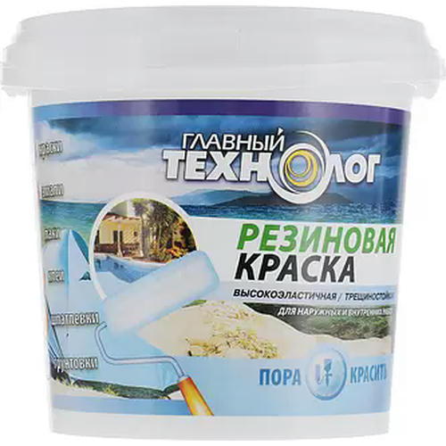 Краска резиновая латекс-акрилатная Главный Технолог предназначена для защитной и декоративной окраски шифера, оцинкованного железа, алюминия, загрунтованного черного металла, черепицы, ондулина, бетона, штукатурки, кирпича, гипсокартона, зашпатлеванных или ранее окрашенных поверхностей, покрытых фактурными составами, а также фанеры, ДСП, ЦСП, ДВП, дерева и т.п. Используется при внутренних и наружных работах.